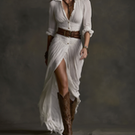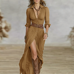 Légi, lélegző pamut és vaiszon hatású anyagból készült, ez a hosszú ruha folyó pliszírozott szoknyát , fordított gallért és egy egyszerű gombos elülső záródást kínál, amely egyensúlyt teremt a kifinomultság és a kényelem között.
