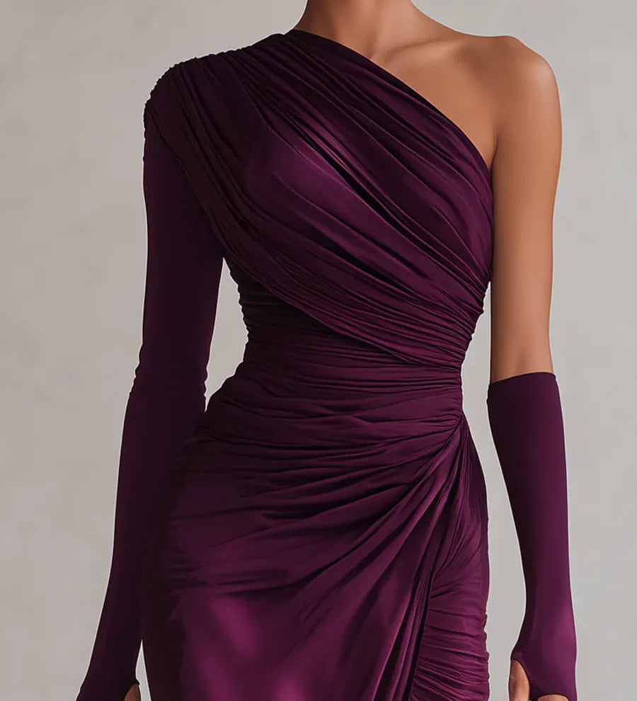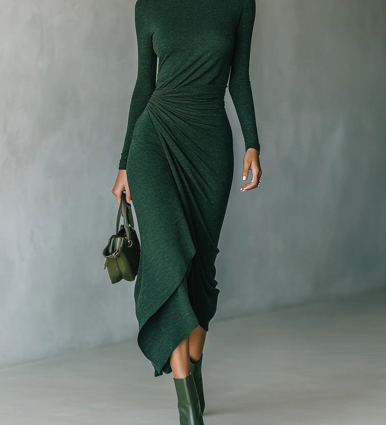 Lenora - Aszimmetrikus, ráncolt midi ruha magas nyakkal, sötétzöld