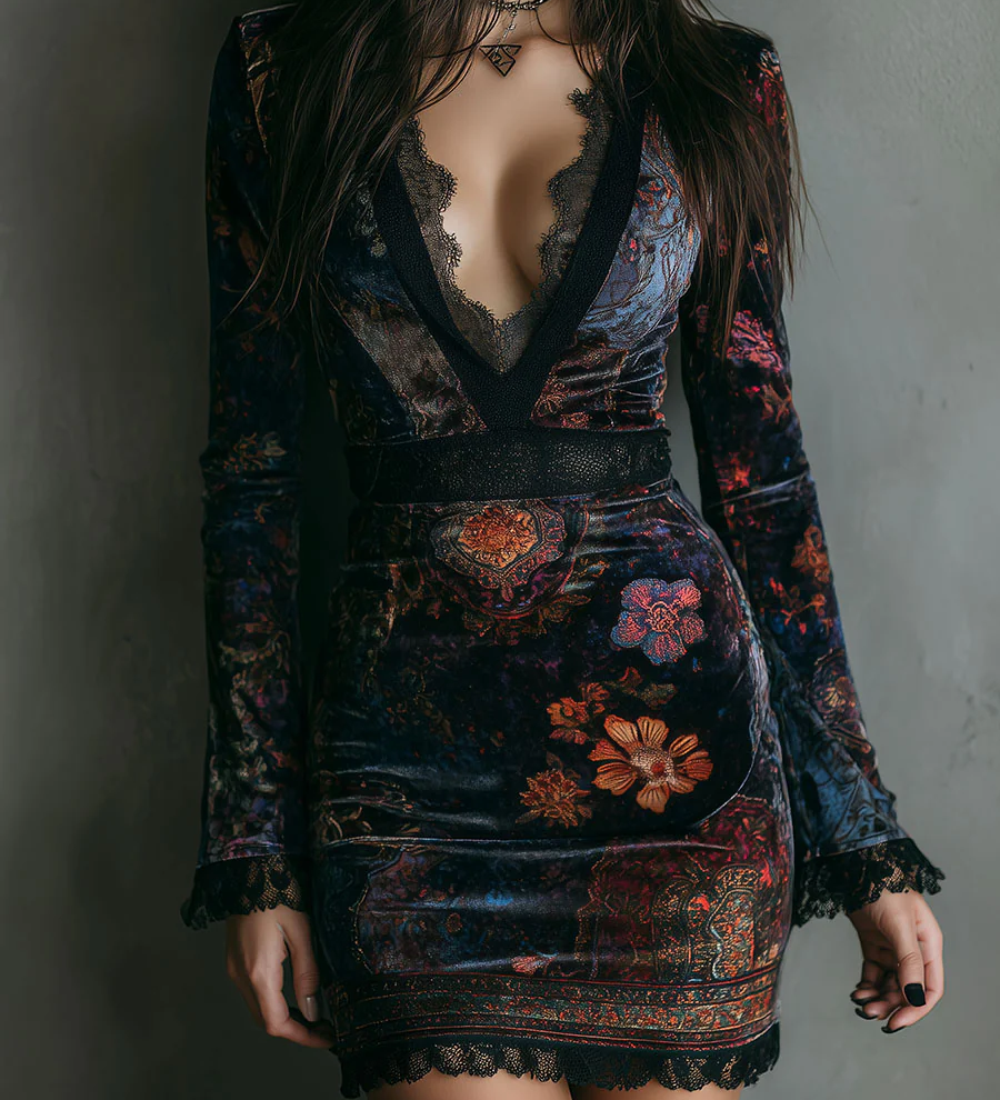 Grazia - Mini Slim-fit Velúr Ruha Virágmintával és Csipkével