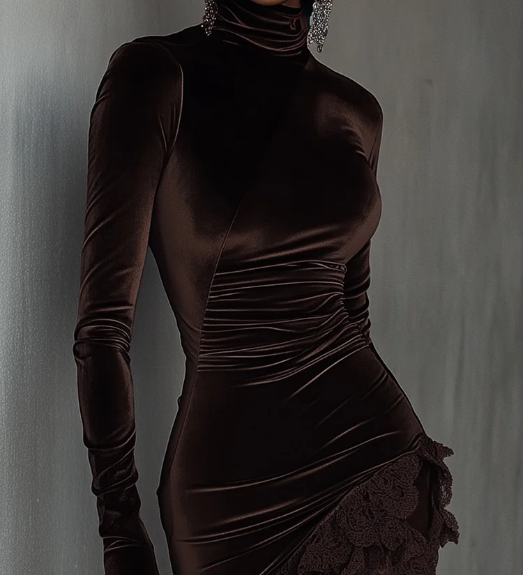 Isabella - Maxi Fitted Ruha Csokoládé Bársonyból Aszimmetrikus Csipkével