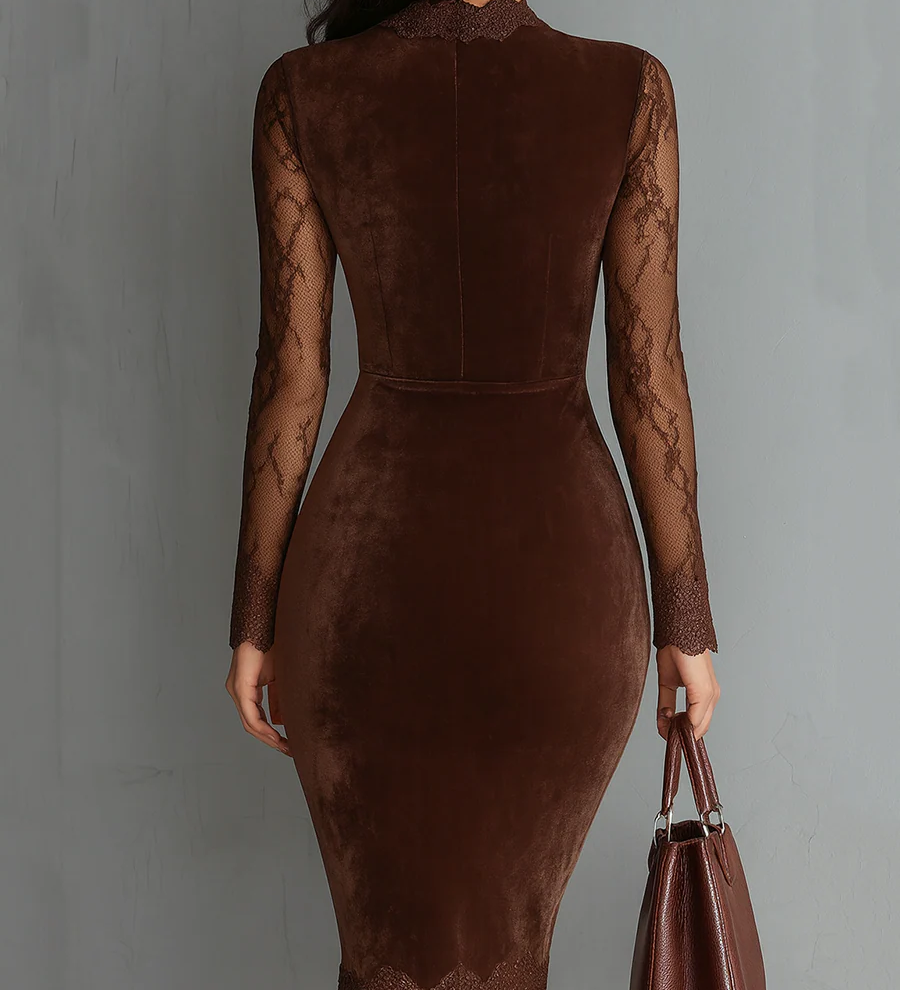 Gaia - Mini Fitted Ruha Csokoládé Bársonyból Magas Gallérral és Csipkés Szegéllyel