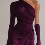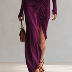 Hosszú, egyvallas ruha elegáns redőzéssel, amely kimeli a sziluettet. Az oldalsó hasítékos szoknya vonzó érintést anélkül, hogy elveszítené a klasszikus stílust, míg a hosszú ujj elegáns egyensúlyt teremt. Tökéletes esti eseményekre, ünnepségekre és különleges alkalmakra.