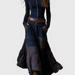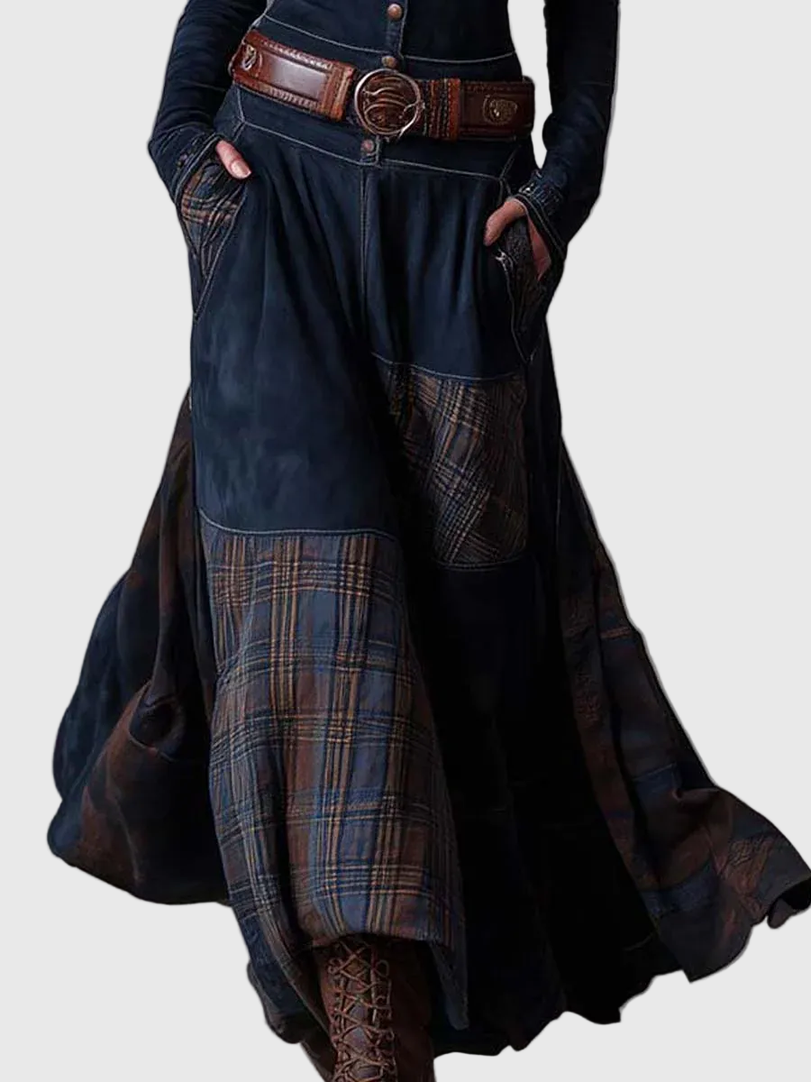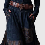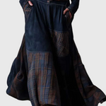 Az Azucena ruha a vintage stílus erejét ötvözi egy időtlen bohémi eleganciával. Tengerészkék öko-suede anyagból és földszínekben pompázó kockás panelekből készült, ez a darab textúrák és mozgás egyesítésével tűnik ki, amely kézműves jellegéről ismert.