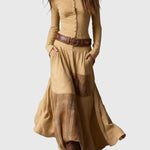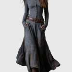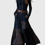 A testhez simuló felső fém gombokkal kiemeli a sziluettet, míg a folyékony szoknya patchwork részletei dinamizmust és bájt adnak minden lépésnél. Egy ruha, amelyet szabad lélekű nők terveztek, akik értékelik a megkülönböztetést.