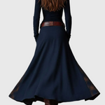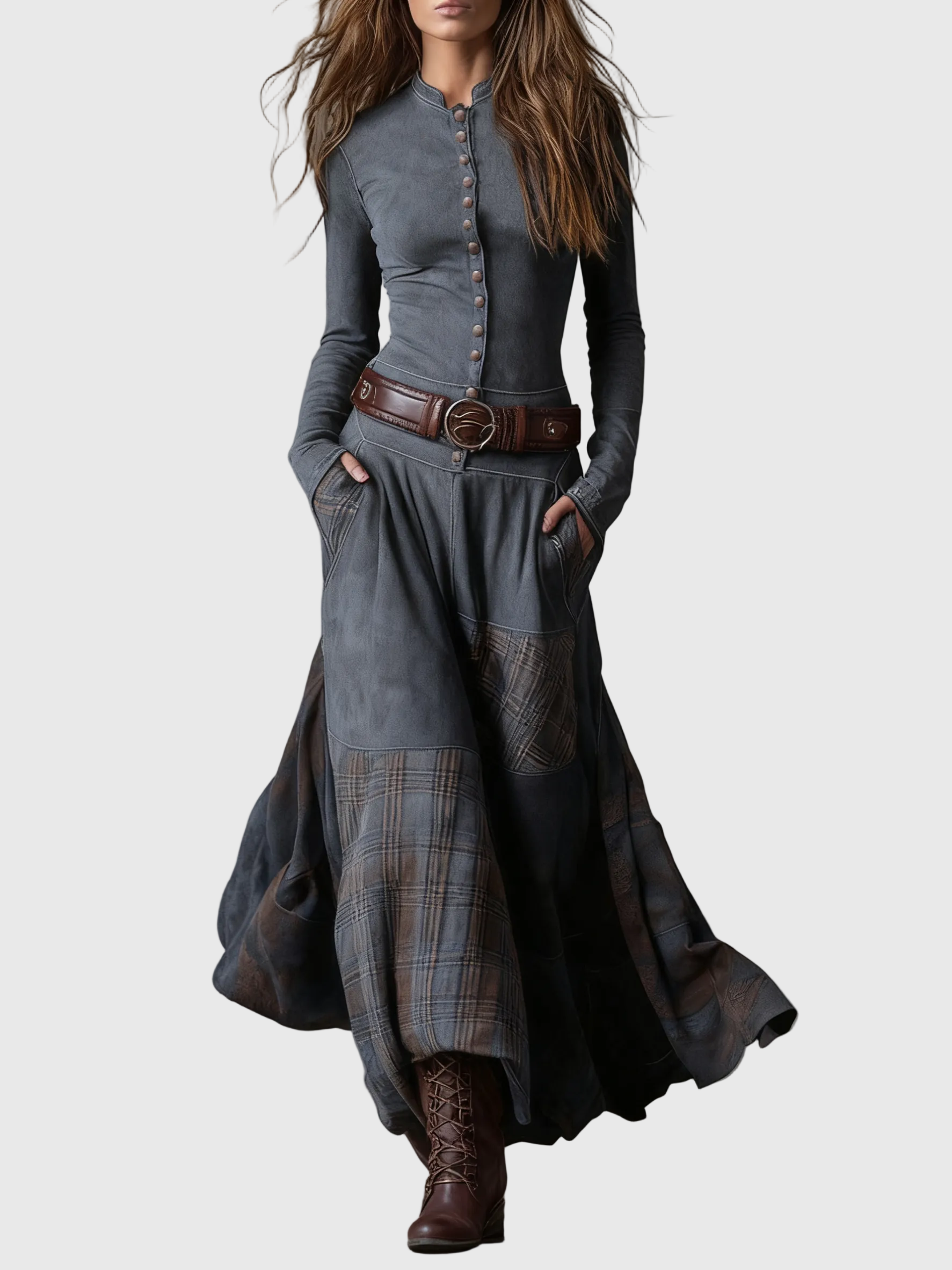 Az Isabelle ruha a vintage stílus erejét ötvözi az időtlen bohémi eleganciával. Haditengerészeti öko-velúrból és földszínű kockás panelekből készült, ez a darab a textúra és a mozgás egyesítésével ki, amely a kézműves jellegéről ismert.