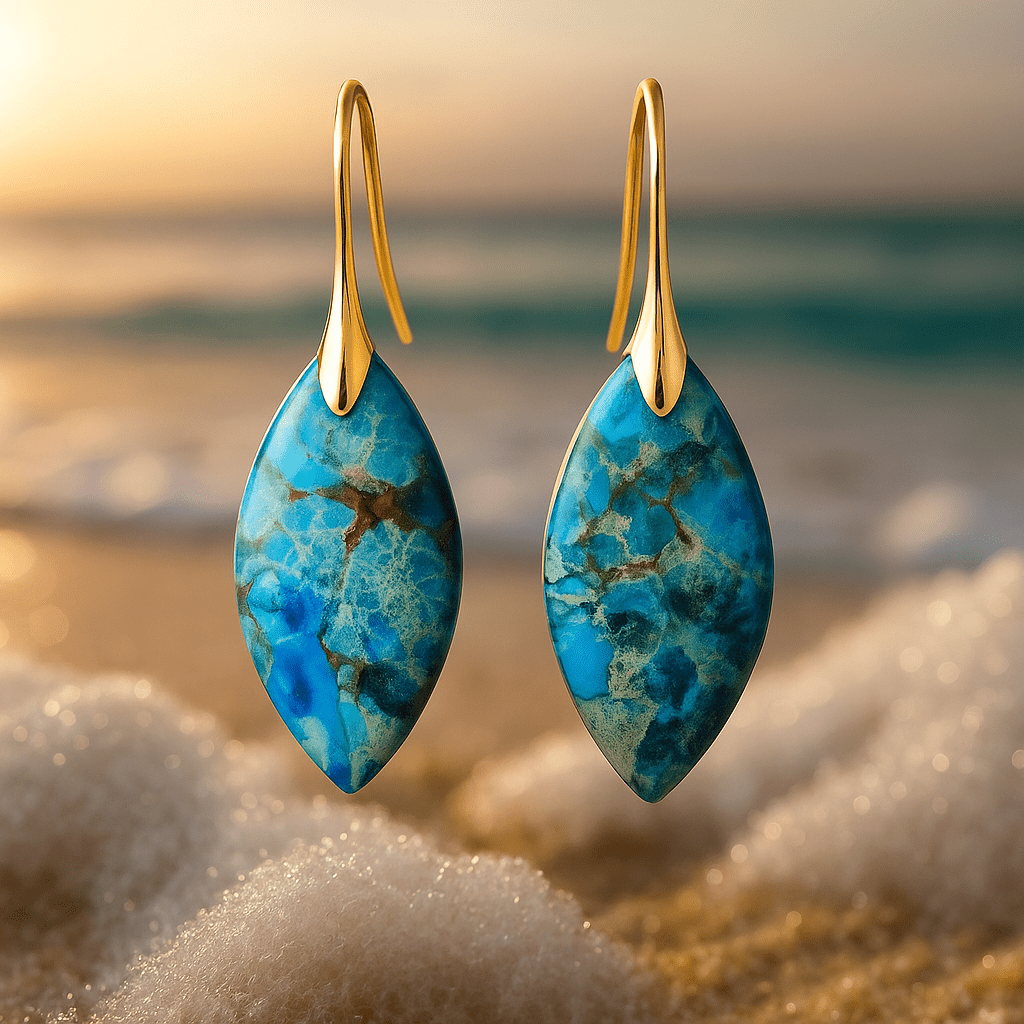 Silje | Orecchini blu mare unisce la finezza dell'artigianato con la bellezza luminosa della costa. Ispirati dalla magia blu di Elafonissi, catturano le sfumature turchesi della chiarezza dell'acqua e di una spiaggia rosa, mentre strisce dorate e color sabbia attraverso la pietra conferiscono lucentezza, profondità e un leggero gioco di colori. Ogni paio è realizzato a mano con pietre selezionate con cura e una struttura di pattern unica, rendendo ogni set unico. Come parte della collezione Avelina, questo set è pubblicato in edizioni limitate e invita a possedere qualcosa di speciale e senza tempo, con provenienza e valore duraturo.