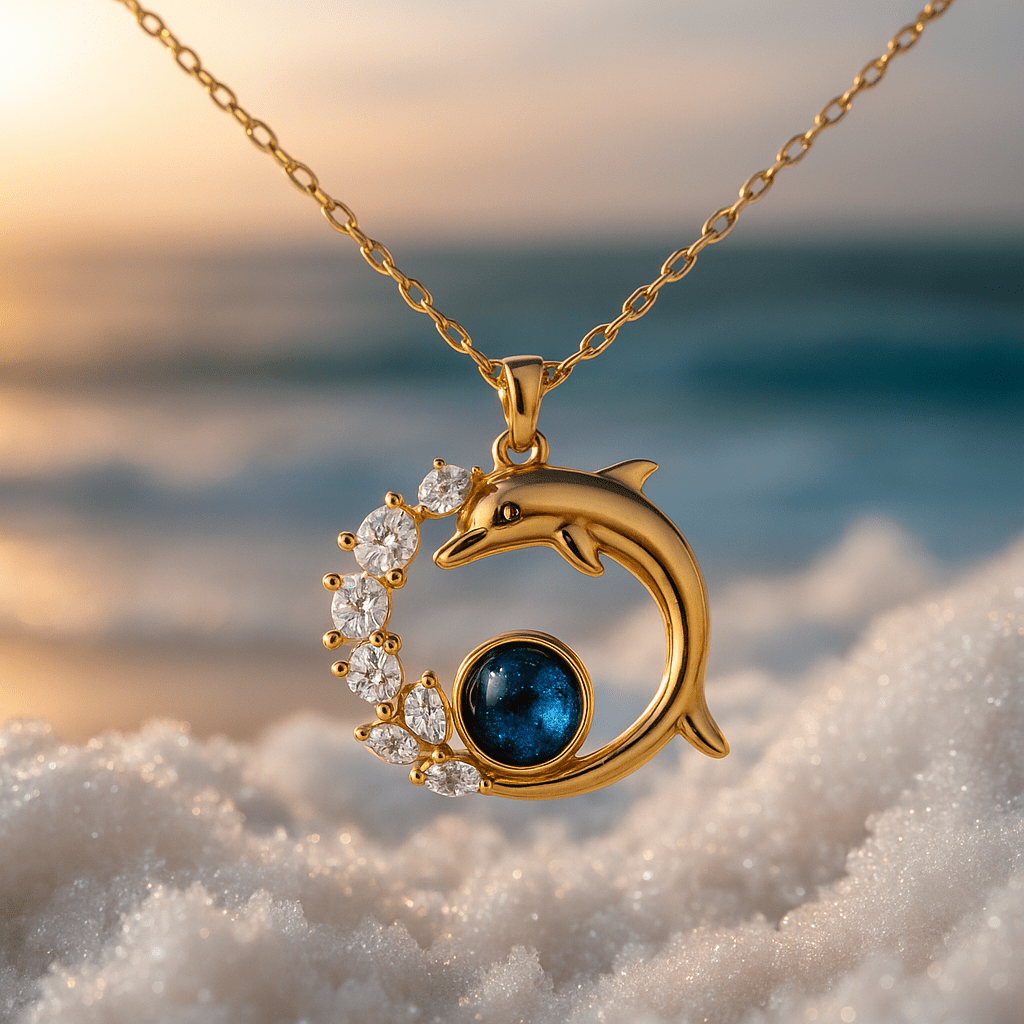 Majken | Ciondolo Delfino emana eleganza marittima e qualità senza tempo. La forma di delfino color oro e la pietra centrale blu cobalto riflettono la cura dell'artigianato e un'eredità di design raffinato. Ogni dettaglio è realizzato con attenzione, così il gioiello porta una forza tranquilla e un lusso discreto, adatto sia alla vita quotidiana che ai momenti speciali. Con un diametro di circa 3 cm, è leggero e comodo da indossare, e in un'edizione limitata porta un'attrattiva naturale da collezione attraverso ricordi e traguardi. Realizzato a mano con attenzione e orgoglio professionale, che riflette una lunga tradizione di design danese.