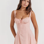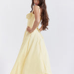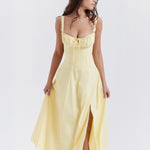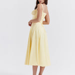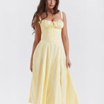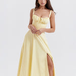 Te ultra nőiesnek fogod érezni magad a 'Aurora' ruhánkban, amely a tökéletes választás a tavaszi és nyári kertipartikhoz. Rugalmas pamutból készült, csodálatos sárga árnyalatban, és felső részén egy fűző található, amely karcsúsítja a derekat, gyönyörű csipkével megkötve a hátrészen. A dekoltázs található egy állítható zsinórral, míg a oldalsó hasíték egy csipetnyi szexepilt ad, felfedve egy darabot a lábadból. Teljesen bélelt a kényelem érdekében, és egy cipzárral rendelkezik a bal oldalon, hogy könnyen fel lehessen venni.