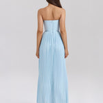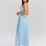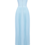 A 'Siena' óceáni eterikus szépsége álmodozó és romantikus légkört teremt. Óceánkék georgette-ből készült, a mellek kagylóformájú redők díszítik, és szépen kiemelik a dekoltázst. A test tökéletesen megerősített, hogy szorosan ölelje a derekat. A maxi redős szoknya elegánsan folyik, biztosítva, hogy minden lépés valóban lenyűgöző legyen. Viseld a nyári elegáns eseményeken és romantikus vacsorákon.
